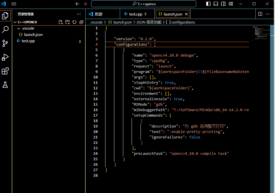 在生成的launch.json文件中复制一下代码(需要配置miDebuggerPath项,注意修改name、preLaunchTask的 opencv版本号):