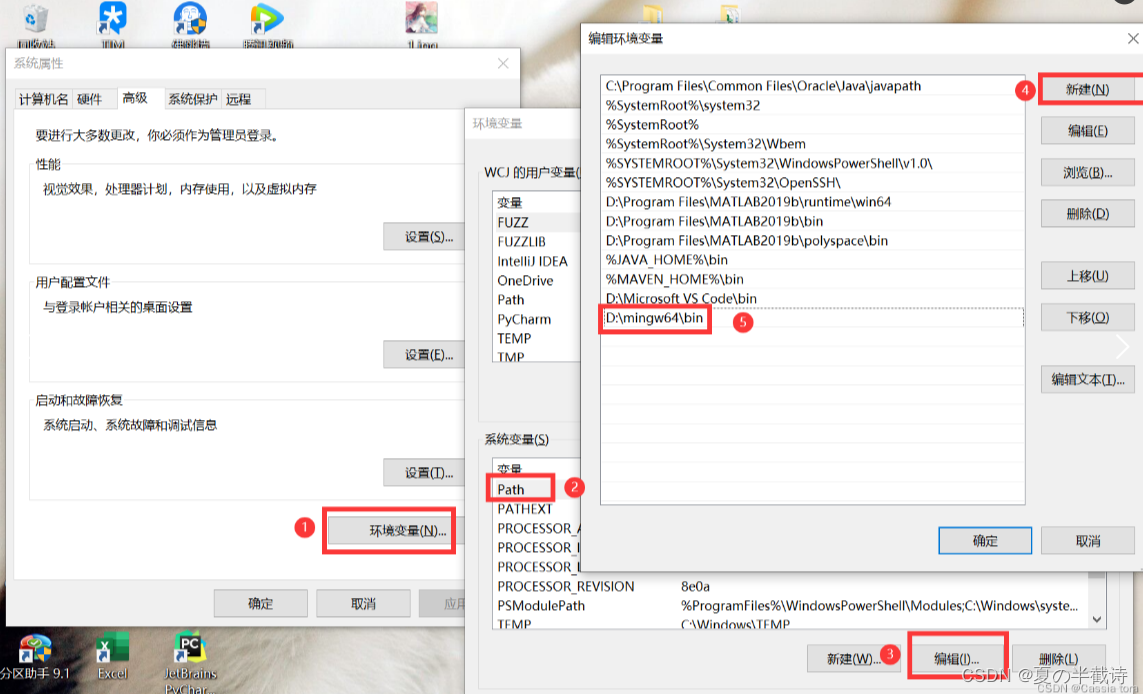 解压[[MinGW-w64]]压缩包,将该文件夹的bin路径添加到环境变量的系统变量中