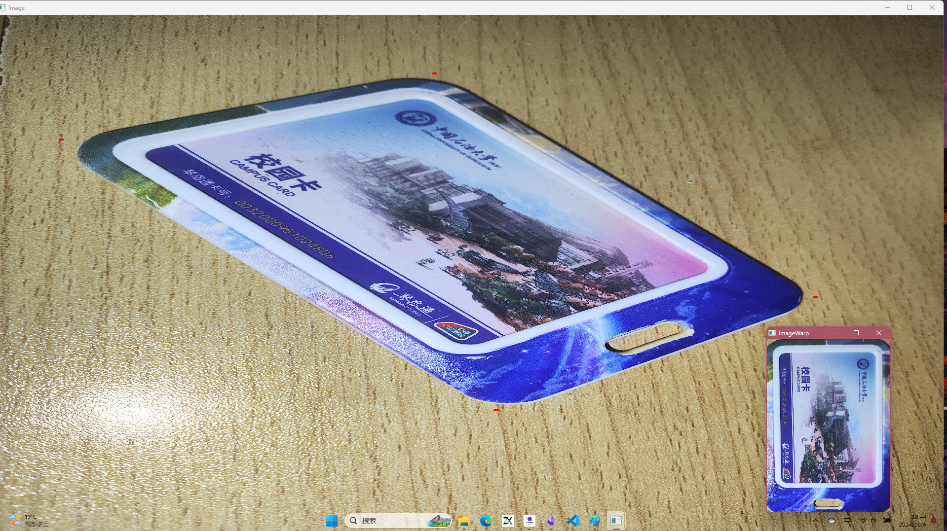 | #include <opencv2/imgcodecs.hpp> #include <opencv2/highgui.hpp> #include <opencv2/imgproc.hpp> #include <iostream> using namespace cv; using namespace std; float w = 250, h = 350; Mat matrix, imgWarp; int main() { string path = "card.jpg"; Mat img = imread(path); std::cout << img.size() << std::endl; Point2f src[4] = { {245, 1098}, {1611, 513}, {1836, 3490},{3002, 2491}}; Point2f dst[4] = { {0.0f, 0.0f}, {w, 0.0f}, {0.0f, h}, {w, h} }; matrix = getPerspectiveTransform(src, dst); warpPerspective(img, imgWarp, matrix, Point(w, h)); for (int i = 0; i < 4; i++) { circle(img, src[i], 10, Scalar(0, 0, 255), FILLED); }